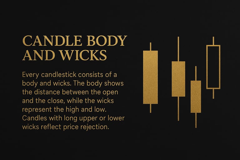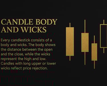 Every candlestick is made of two main parts: the body and the wicks. The body is the thick part of the candle. It shows the important part of the price move, which is the distance between where price opened and where it closed. If the body is big, it means price moved strongly. If the body is small, it means price did not move much and the market was unsure.