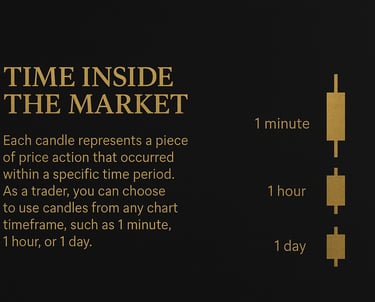 A candlestick is simply a way to show how price moved during a certain time. That time could be one minute, one hour, one day, or even one week. Each candlestick shows where the price started, where it went up to, where it dropped to, and where it finally closed. So with just one candlestick, you can understand the full story of what happened in the market during that time.