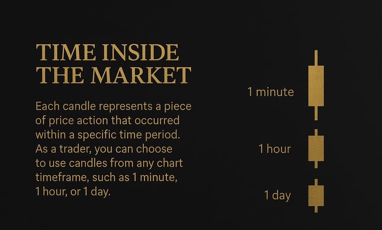 Every candlestick belongs to a timeframe. A timeframe simply means how much time one candle represents. For example, on a 1-minute chart, one candle shows one minute of price movement. On a 1-hour chart, one candle shows one hour. On a daily chart, one candle shows one full day of trading.