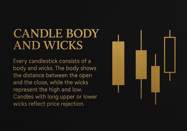The wicks are the thin lines above and below the body. The top wick shows how high price tried to go, and the bottom wick shows how low price tried to go. Wicks tell you about rejection. If a candle has a long top wick, it means price tried to go up but was pushed down by sellers. If it has a long bottom wick, it means price tried to go down but buyers pushed it back up.